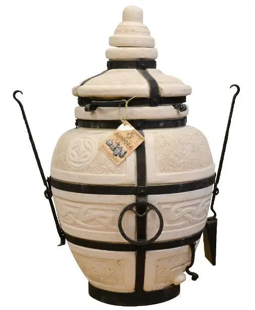 Толщина стенки - 5 см Высота - 82 см Высота без крышки - 61 см Диаметр горла - 29 см Диаметр - 54 см Кол-во шампуров в комплекте - 8 шт. (длина рабочей части - 34 см / общая длина - 45.5 см) Комплектация - кочерга, совок,колосник, приспособление для подвешивания шампуров - по 1 шт. Настоящие ценители восточной кухни знают, как важен сокровенный очаг, на котором совершается приготовление изысканных блюд. С глубокой древности люди использовали для этого глиняную дровяную печь или тандыр. История говорит о том, что такие очаги даже применялись для отопления жилища.