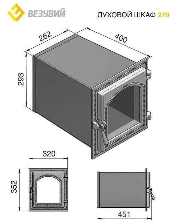 Духовка фирмы Везувий представлена в цвете антрацит. Модель изготавливается из комбинации чугуна и стали, дверца выполнена из чугуна, а корпус сделан из стали. Духовой шкаф устанавливается в кирпичную печь или мангал и предназначен для приготовления и разогрева пищи. Герметичная дверка