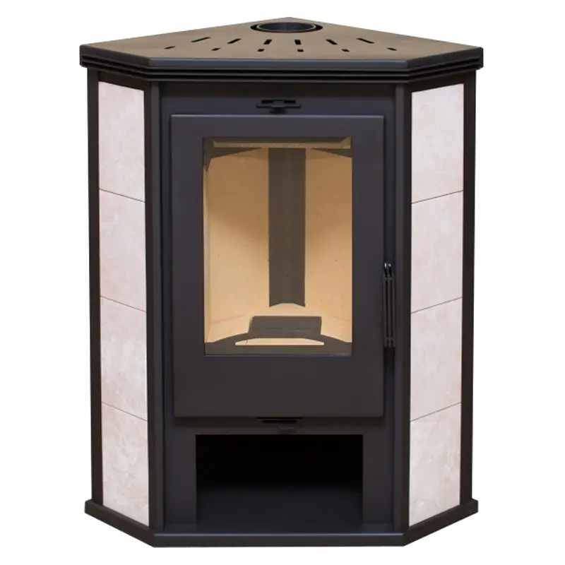 Печь рассчитана на установку в небольшом загородном доме, в коттедже или на даче. Максимальная площадь обогрева составляет 70 кв.м. Печь-камин выполнена из стали, трапециевидный корпус окрашен черной термостойкой эмалью, большая дверца с жаропрочным стеклом с обеих сторон подчеркнута облицовкой светлой керамической плиткой.