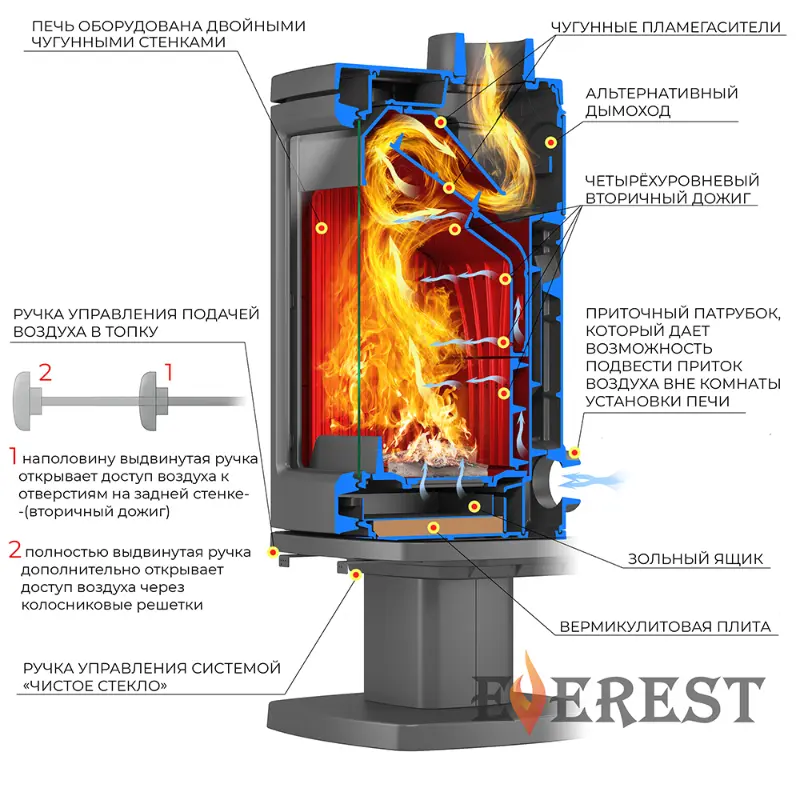 Высокая теплоотдача – мощная топка из чугуна с толщиной стенок 8 мм обеспечивает равномерный прогрев помещения