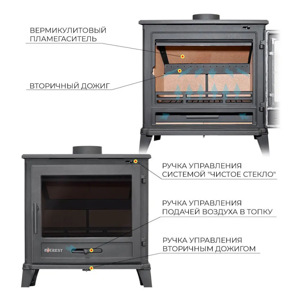 Печь-камин имеет два пламегасителя: самый нагруженный пламегаситель изготовлен из вермикулита, второй из жаростойкого чугуна. Топка печи-камина усилена вермикулитовыми плитами с системой двухуровневого вторичного дожига. С помощью этой функции по каналам подачи вторичного воздуха поступает воздух, который нагревается при прохождении между топочной камерой и стенками корпуса. Далее нагретый воздух через дефлектор поступает в топку, перемешивается с газами - продуктами горения, чем вызывает повторное возгорание.