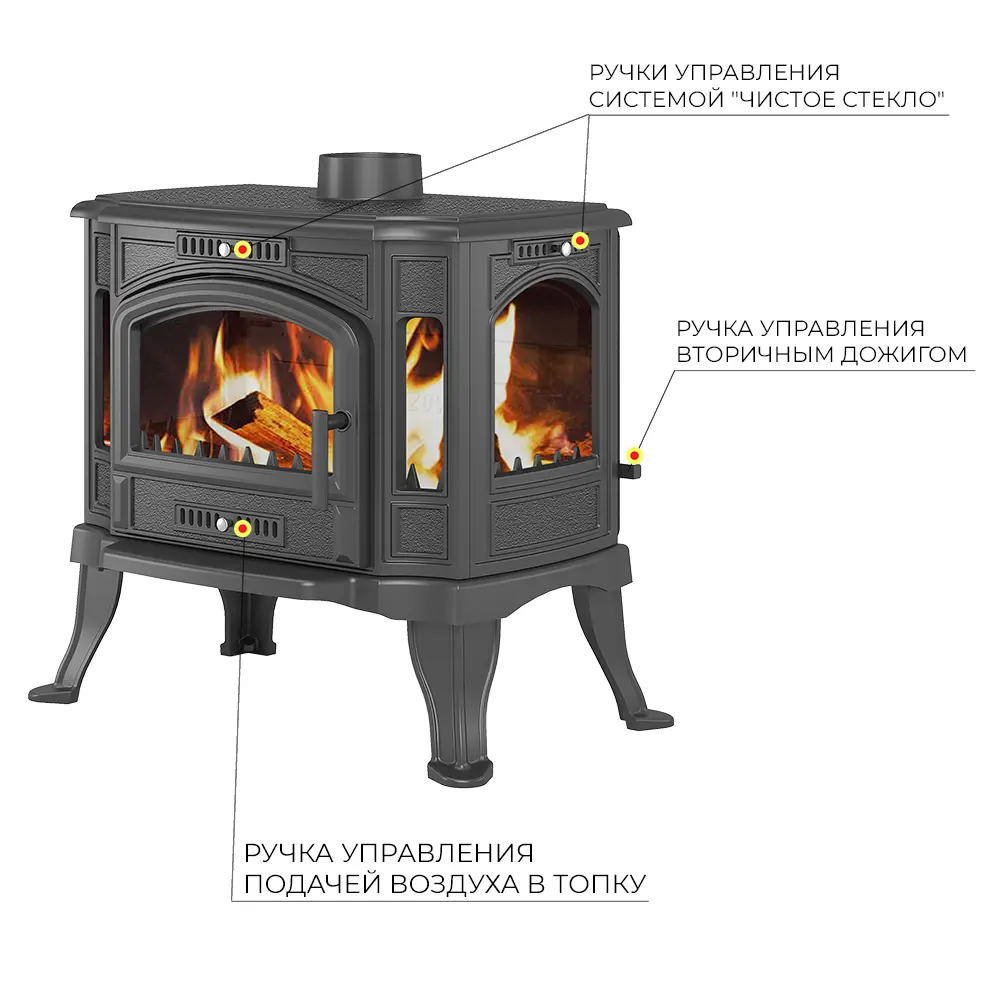 Печь-камин Везувий KZ-14SР "Антрацит" изготовлена из качественного чугуна с толщиной стенки 8-10 мм. Модель рассчитана на обогрев помещений объёмом до 280 м³.Топочная камера с двойными чугунными стенками. В нижней панели предусмотрена колосниковая решётка. Дверь изготовлена из чугуна и оснащена большим панорамным стеклом в виде арки. С двух сторон от двери установлены две стеклянные вставки. На модели KZ-14Р по бокам установлены стекла. Чистота стекла во время работы обеспечивается системой подачи воздуха на внутреннюю сторону стекла. Воздух отсекает дымовые газы и пламя от поверхности стекла, предотвращая закопчение и потемнение стекла. На моделях KZ-14 , KZ-14S ручка управления системой размещена в верхней части передней панели, над дверью у KZ-14Р с боку над стеклом. В нижней части двери размещена ручка задвижки для подачи воздуха на первичное горение