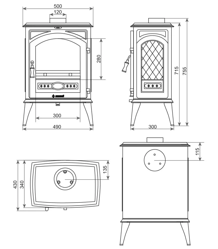Чугунная дверца с фирменным логотипом и стеклом диагональю 370 мм оснащена ручкой с регулировкой силы прижатия.